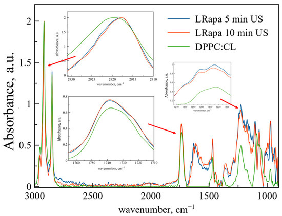 Normalized ATR-FTIR spectra of DPPC:CL 80:20 weight% liposomes and LRapa with 5 and 10 min of extra sonication. Total lipid concentration 5 mg/mL, 0.02 M sodium phosphate buffer solution pH 7.4, 22 °C. Rapa spectra were subtracted as a background. Spectra of empty liposomes are green, spectra of LRapa are blue (5 min) and red (10 min). In the insets, areas of νas(CH2), ν(CO), νas(PO2−) are presented.