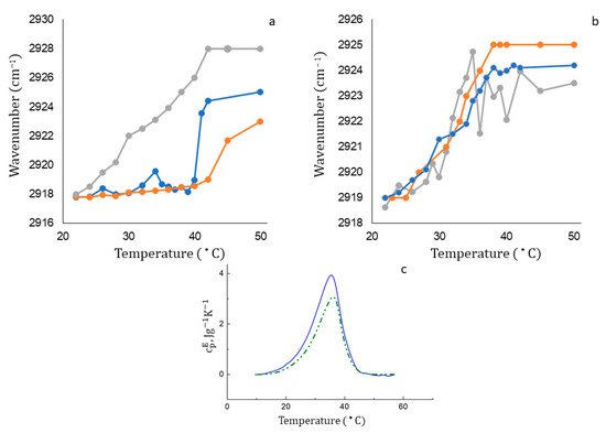 For a gel-like bilayer, e.g., DPPC:CL, νas(CH2) is localized in the region of 2917–2920 cm−1, and for a fluid membrane, this value easily reaches 2925 cm−1 and more. For DPPC liposomes, the phase transition occurs in a narrow temperature range from 40 to 44 °C, which is consistent with the literature data (Figure 5a, ginger line).