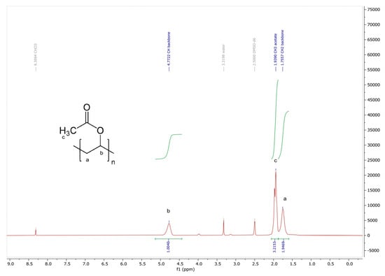 The polymerization of PVAc was conducted in chloroform, which resulted in better control of the MW compared to other approaches, and batch production of the polymer could be achieved. A sufficiently low MW was sought, to allow for reconstitution and subsequent experimentation. Therefore, tuning of the solid content and initiator concentration allowed for a sufficiently low degree of polymerization, resulting in a material with the molecular weight characteristics presented in Table 1, which were determined by SEC. The nuclear magnetic resonance (NMR) spectrum of PVAc following synthesis is shown in Figure 1. All synthesis work was conducted by Chempilots (Farum, Denmark).