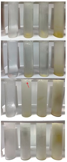 (a–d). PVA samples 1–4 after complete crystallization: (a) pure water and PVA 1 with 10%, 20%, and 50% PVA content by mass (left to right), (b) pure water and PVA 2 with 10%, 20%, and 50% PVA content by mass (left to right), (c) pure water and PVA 3 with 10%, 20%, and 50% PVA content by mass (left to right), (d) pure water and PVA 4 with 10%, 20%, and 50% PVA content by mass (left to right).