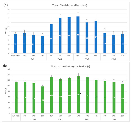(a,b). Initial (a) and complete (b) crystallization times for pure water and PVA samples 1–4 with 10%, 20%, and 50% mass content. Note: * indicates that approximately 3 mm of the top portion of the samples in the test tube remained liquid even after the remainder of the sample was completely frozen.