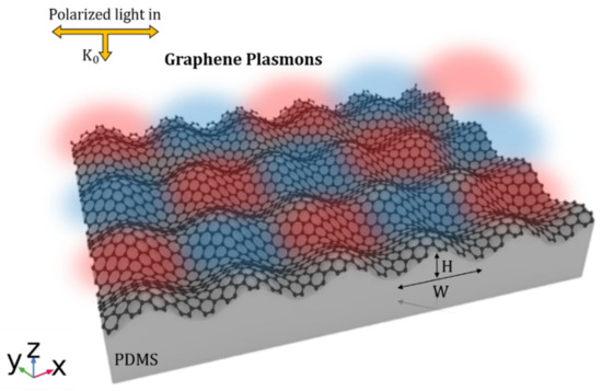The plasmonic resonances of the crumpled graphene structures placed on different substrates have been investigated. Figure 1 illustrates the proposed structure, which consists of biaxially crumpled graphene on a stretchable polymer substrate. The system is illuminated by transverse magnetic (TM) polarized light propagating along the crumpling directions x and y in the direction normal to the structure (K0) from the top. The structure is described by crumpling width (W) and height (H).