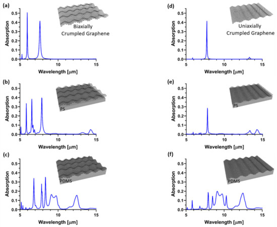 To compare the sensitivity of biaxially crumpled graphene with that of uniaxially crumpled graphene, the plasmonic properties of devices composed of the two types of crumpled graphene on various substrates were studied. We investigated the absorption spectrum of the proposed structure under normal incidence to obtain plasmonic resonances in the proposed crumpled graphene structures. As shown in Figure 2, a higher number of plasmonic modes with larger absorption intensities and lower FWHM values (stronger plasmonic resonances) were observed for the free-standing biaxially crumpled graphene and the graphene supported on polystyrene (PS) and polydimethylsiloxane (PDMS) substrates as compared to the uniaxially crumpled graphene. For example, biaxially crumpled graphene supported on a PS substrate exhibited two plasmon resonances at wavelengths of approximately 7.8 and 5.8 μm, with absorption intensities of 0.4 and 0.34 and FWHM values of 144 and 48 nm, respectively (Figure 2b). However, for the uniaxially crumpled graphene structure on PS, one plasmon resonance appeared at approximately 7.8 μm, with an absorption intensity of 0.28 and FWHM of 79 nm (Figure 2e). The plasmon resonances of graphene can strongly overlap with the absorbance peaks of PDMS substrates in mid-infrared range. This results in damping, attenuating, and broadening of plasmon modes which negatively affect the sensing performance of the device. This problem can be addressed using biaxially crumpled graphene structure by having more plasmonic resonances which are largely detuned from destructive absorbance peaks of PDMS. Thus, distinct and sharp spectral resonances can be obtained by creating a large frequency detuning between the plasmon resonances and PDMS absorbance peaks using biaxial structure. The effect of the polymer substrate may not be easily excluded in practical sensing application, thus having two or more resonances which are largely detuned from the absorbance peaks of the substrate can improve the sensing performance of the device as these plasmon modes are sharp and isolated.