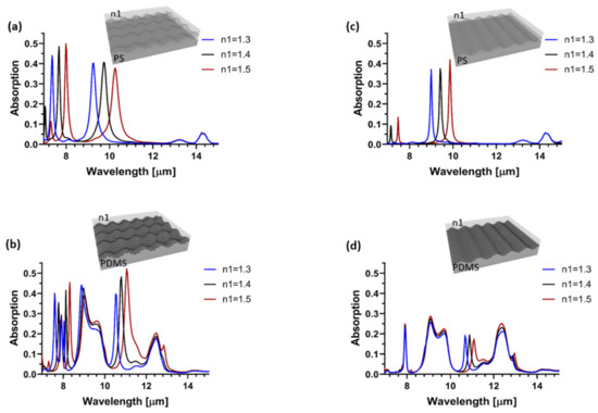 Figure 3. Plasmonic resonance shifts of biaxially crumpled graphene supported on (a) flat PS and (b) corrugated PDMS substrate; and those of uniaxially crumpled graphene on (c) flat PS and (d) corrugated PDMS substrate, when the RI of sample n 1 changed from 1.3 to 1.5, with geometrical parameters of W = 250 nm; H = 300 nm; Ef = 0.64 eV; and μ = 10,000 cm2/(V·s).