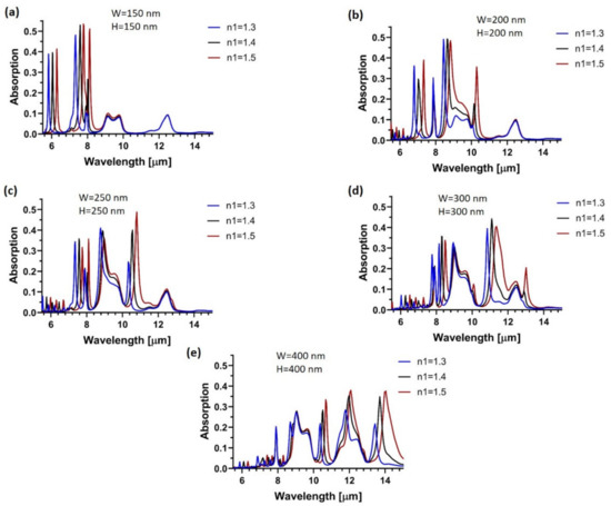 Figure 4. Geometry dependence of the plasmonic resonance shifts in biaxially crumpled graphene structures supported on the PDMS substrate with aspect ratio W/H = 1 for (a) W = H = 150 nm, (b) W = H = 200 nm, (c) W = H = 250 nm, (d) W = H = 300 nm, and (e) W = H = 400 nm. The RI of sample n 1 varies from 1.3 to 1.5. The electronic properties of graphene are set as Ef = 0.64 eV and μ = 10,000 cm2/(V·s).