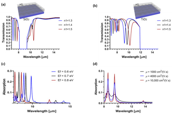Figure 5. Substrate effect for plasmonic resonance shifts of biaxially crumpled graphene structures supported on (a) SiO2, and (b) TiO2, when the RI of solution atop the graphene n1 changes from 1.3 to 1.5, with structural parameters of W = 250 nm; H = 300 nm; E f = 0.64   eV ; and μ = 10,000   cm 2 / ( V · s ) . (c) Electrical turnability of biaxially crumpled graphene structures by varying Ef from 0.6 to 0.8 eV at μ = 10,000   cm 2 / ( V · s ) . (d) Optical absorption spectra of biaxially crumpled graphene for various µ values from 1000 to 10,000 cm2/(V·s) at EF = 0.64 eV.