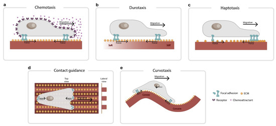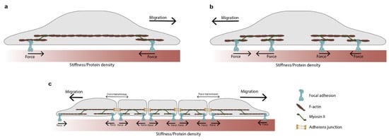 The first step in undergoing directed cell migration is to sense differences in the magnitude of the stimuli across the cell body or tissue. For most forms of directed cell migration, physical forces have a minor role in gradient sensing. This is the case of single-cell chemotaxis (Figure 1a), in which signal detection is achieved through specific receptors such as G-protein-coupled receptors in neutrophils and Dictyostelium cells [27] or by tyrosine kinase receptors in breast cancer cells [28]. However, when directed cell migration is driven by mechanical cues such as stiffness, topology, or substrate–ligand density, physical forces have a major role in signal detection. In such cases, the same structures that allow the cells to transmit forces to the substrate also allow the cells to detect variations in the properties of the ECM.