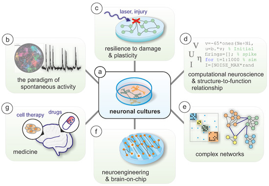 Overview of research projects in Jordi Soriano’s laboratory. (a) Neuronal cultures, prepared from either human induced pluripotent stem cells or rodent primary cultures, constitute the central experimental tool. Activity in these cultures is typically recorded using calcium fluorescence imaging; (b) spontaneous activity in cultures, which refers to the capacity of a neuronal network to activate without the need of any external drive. We investigated this phenomenon and observed that spontaneous activity emerges as a subtle interplay between connectivity and noise. See Refs. [6,7,8,9,10]. (c) The easy accessibility of neuronal cultures offers a unique scenario to investigate resilience to damage, in which neurons are targeted using a laser or a sharp tool. In our studies, we observed that neuronal networks can cope with substantial damage and recover from it. See Refs. [9,11,12,13,14]. (d) Computational models are used as complementary tools to experimental data, allowing us to better understand key results from experiments and theoretical models and make predictions. See Refs. [7,8,9,15,16,17,18]. (e) Complex networks provide the analytic backbone to understand experimental and numerical data, specifically to quantify the physical organization and information flow in neuronal networks. See Refs. [7,8,9,10,12,16,19,20,21,22]. (f) Neuroengineering deals with the concept of controlling the positioning and connectivity of neurons, with the goal to induce brain-like architectures in vitro, and in an effort to understand major principles of brain functioning. See Refs. [19,22,23,24]. (g) The relative simplicity of neuronal cultures makes them excellent platforms to investigate neurological disorders, in which neuronal connectivity or dynamics are compromised. In partnership with different research institutes in medicine, we have helped investigating the goodness of cell therapies, e.g., gene editing or transplantation, as well as the potential use of new chemical compounds as pharmacological agents. See Refs. [14,20,25,26,27,28,29,30,31,32].