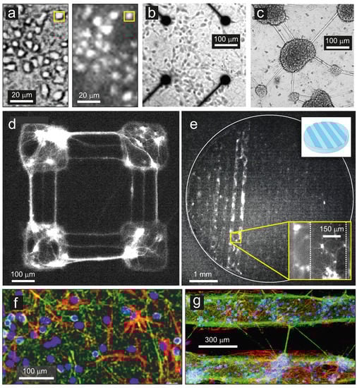 Regardless the preparation, neurons in our laboratory are typically grown on flat substrates such as circular cover glasses 3–6 mm in diameter [6,7,15]. By using adhesive proteins previously applied to the substrate, neurons cover homogeneously the surface (Figure 2a-left), although fluctuations in spatial distribution occur and neurons mildly aggregate. Calcium fluorescence markers can then be used to detect active neurons at a cellular resolution, with neurons appearing as bright round objects (Figure 2a-right). Alternatively, multielectrode arrays can be used to detect activity at high temporal resolutions (Figure 2b), but with the added difficulty that the strength of the detected signal depends on the proximity of the neurons to the electrode. When no adhesive proteins are applied to the substrate, neurons aggregate forming compact islands or clusters connected to one another (Figure 2c), a configuration that is often known as self-organized modular networks [41,46], in which the number, distribution, and interconnectivity of the clusters vary among preparations. By contrast, engineered neuronal networks are those in which neuronal modules as well as their interconnectivity are imprinted on the substrate using microfabrication techniques (Figure 2d), allowing for a higher control of the resulting network [22]. Neuronal networks that combine both free self-organization and rigid engineering can be shaped by using topographical designs [19], in which neurons grow on a two-level substrate with mild differences in height, and with the topography itself coarsely guiding the connectivity of the network (Figure 2e).