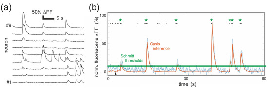 Fluorescence calcium imaging and spikes inference. (a) example of normalized fluorescence traces for nine neurons in a typical experiment with primary cultures. Data were acquired with the genetically encoded calcium indicator GCaMP6s. Sharp increases in the signal reveal the emission of action potentials; (b) neuronal spikes inference, in which the original fluorescence trace (blue signal) is analyzed to obtain the spikes via the Schmitt trigger method (green lines and stars) or the Oasis method (red curve and black dots). The latter uses biophysical information to predict the fluorescence signal and its containing spikes, but errors occur (black arrowhead towards the beginning of the recording), with noisy fluctuations in the signal being ascribed as activations.