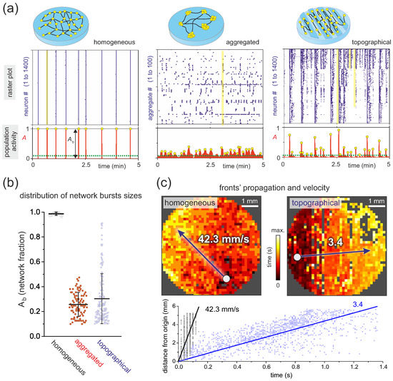 Data analysis. (a) spontaneous activity in three different neuronal culture configurations, obtained from recordings with GCaMP6s as calcium indicator. The collection of inferred spikes is visualized in the form of raster plots (top plots, each blue dot corresponding to a spike). Collective activity events or network bursts appear as bands of coherent activity (yellow outline). Population activity (bottom plots) is quantified by vertically summing up the raster plot. Strong network bursting leads to sharp peaks in the signal, denoted . (b) The distribution of values reveals the richness in dynamical states of the network. Homogeneous cultures are locked in a strong bursting behavior and in all events, while aggregated and topographical cultures exhibit a broader distribution; (c) top, each individual network burst can be analyzed to portray its spatiotemporal structure (black-yellow color pattern) and initiation point (white circle). Bottom, the data of activity propagation can be plotted to obtain the characteristic propagation velocity as a linear fit. In the examples shown, front propagation in a topographical substrate is about 10 times slower than in a homogeneous one.