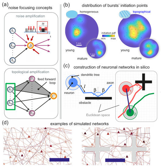 Noise focusing’ concept and numerical simulations. (a) sketch of the two major ingredients that shape noise focusing. Top, ‘noise amplification’ concept. Without noise, neuron B needs to receive a quorum of inputs (black arrows and upper vertical bars) in a time window from neurons to activate. Input noise (red arrows and bars) relaxes the quorum condition and the neuron B can effectively activate with fewer spikes from other neurons. Bottom, ‘topological amplification’, by which spikes elicited by neurons are amplified by network motifs such as feed forward loops (gray triangle). In the sketch, neurons and emit two spikes, which become amplified by the loops involving neurons and , effectively providing an input of four spikes to neuron C; (b) distribution of burst initiation in standard and topographical cultures, and comparing two developmental stages of the cultures. The black dots are the observed initiation points of network bursts, and the blue-yellow pattern is the corresponding probability distribution function (pdf) of burst initiation. The yellower a region of the culture is, the higher the probability of burst initiation is in that region; (c) in silico model of a neuron grown on a two-dimensional substrate. The neuronal soma and dendritic tree are simulated as discs, and the axon as concatenated segments of length ℓ. Interactions with obstacles are implemented as a simple rule by which an incident axon onto a surface is reflected with the same angle . Connectivity is established whenever the axon of a neuron 1 crosses the dendritic tree of a neuron 2; (d) examples of positioned axons in the absence (left) and presence (right) of obstacles. Neurons are shown as triangles for clarity, with their color intensity proportional to their connectivity. Blue scale bars represent 100 m.
