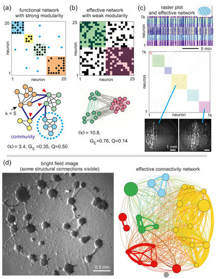 In our research, we extensively used resources from complex networks to describe, quantify, and model the organization of our in vitro and in silico cultures, particularly during development [19,21], when modeling the impact of modularity and spatial constraints [16,22], or when physicochemical perturbations were applied [12,14]. In most cases, we computed effective connectivity from raster plots and extracted all relevant information. It must be noted that we, and other groups, often used the term functional organization to refer to all set of network properties exhibited by our neuronal cultures, although the obtained connectivity matrices are effective, i.e., computed using transfer entropy.