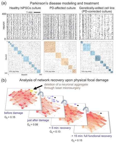 A first example of our efforts is in the context of genetic variants of Parkinson’s disease (PD), in which we investigated network alterations during the development of affected hiPSC-derived cultures [20,27] and explored the capacity of CRISPR-Cas9 gene editing to correct for the genetic anomaly and restore cultures’ health [20,28,29]. As shown in Figure 7a, left, healthy cultures display raster plots in which mild network bursts are combined with abundant individual activations, leading to effective connectivity matrices with a rich set of small communities. For PD cultures, by contrast (Figure 7a, center), raster plots are dominated by strong network-wide bursts that shape an effective networks with relatively bigger communities, indicating an excessive integration in the network, i.e., PD cultures have a smaller Q than controls [20]. Interestingly, the gene-edited cell line exhibits a behavior that relaxes this strong bursting (Figure 7a, right), leading to a raster plot and an effective connectivity matrix that approaches the healthy condition.