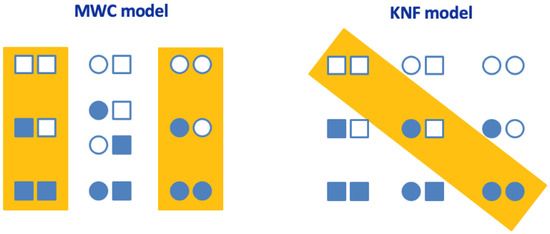 Cooperativity models in oligomeric proteins. The general allosteric model for a protein with two binding sites is shown. Each subunit can adopt two conformationally and functionally different conformations: T (tense) conformation (square), and R (relaxed) conformation (circle). The orange rectangle encloses the relevant conformational states in each model. Empty and filled subunits represent ligand-free and ligand-bound subunits, respectively.