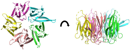 3D structure of ClpP from Mycobacterium tuberculosis, determined by cryo-electromicroscopy at 3.10 Å of resolution (pdb ID: 6vgk) [28]. The fourteen subunits are shown in different colors. Two heptameric rings form a dimer resulting in a heptadecameric protein.