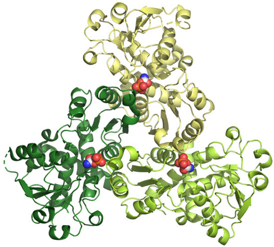 3D structure of human ATCase determined by X-ray diffraction at 2.10 Å of resolution (pdb ID: 5g1o) [34]. The three subunits are shown in different colors, and the substrate carbamoyl phosphate is shown in CPK mode.