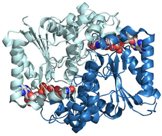 The 3D structure of human NQO1 determined by X-ray diffraction at 2.01 Å of resolution (pdb ID: 5ea2) [36]. The two subunits are shown in different colors. FAD bound to each subunit is shown in the CPK mode.