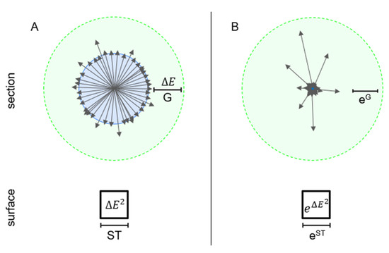 Compartments of the self-organizing system shown schematically in two scales: (A), energy scale, (B), thermodynamic activity scale. System core is blue, arrows represent chemical potentials of system components in interaction space, shown in green. Arrows represent vectors with the length as chemical potential and direction as specificity. G, Gibbs free energy; S, entropy; T, temperature; E, energy.