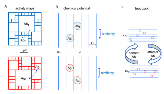 Activity and energy diagrams of antibodies and antigens. Thermodynamic activity, chemical potential and structural similarity appear in activity maps (A) and energy diagrams (B) for antibody (blue) and antigen (red). Square areas in the map represent activity; neighborhood distance (blue double arrows) means similarity. (C) Higher chemical potential results in better Ag-binding efficiency for effector Abs and higher Ag sensitivity for sensor Abs. Removal of Ags lowers signaling in sensor B cells; sustained Ag presence and immune stimulation triggers sensor B cells and triggers generation of effector Abs.