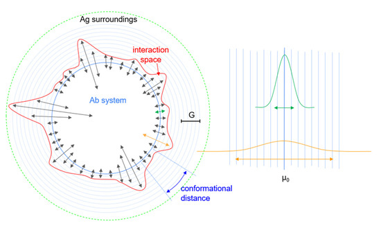 Throughout the article, we examine the adaptive immune system in an abstract space called configuration space. Configuration here refers to the arrangement of all the constituent Abs in a system of interacting molecules. A general Ab structure is modified by the arrangement of atoms that contribute to the binding site of the Abs, creating a huge, conformational landscape. Since the formation of non-covalent bonds between interaction partners requires shape congruency, arrangement in this space determines both Ab and Ag structure and binding specificity and strength. The manifold enclosing components of the immune system in this configuration space thus define both Abs and Ags. In this space, cells and molecules of the immune system, corresponding to clones bearing or being a particular Ab, respectively, are positioned according to their potential to interact with a target and in the direction of the target. The interaction potential is the chemical potential of the Ab in body fluids. Targets are Ag molecules that drive the evolution of the system. Considering a three-dimensional Euclidean space as the configuration space of the system, target Ag shapes—epitopes—form a continuity on an imaginary, spherical canvas enclosing the system (Figure 1).