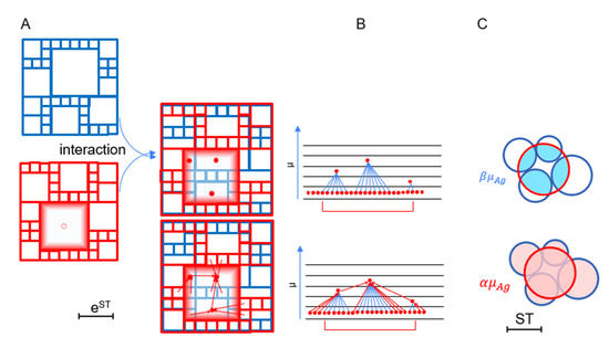 Schematic organization of antigen transfer networks and network hierarchy of molecular interactions. (A) By first overlaying the activity maps of antigens (red grid) and antibodies (blue grid), we obtain network nodes. Nodes (red dots, shown only for highlighted box) are assigned to each box in the overlayed maps. (B) Nodes are sequentially linked within each red box by applying grids with increasing side length and joining nodes in smaller boxes to nodes in the biggest box until all nodes with the red box are linked. Node hierarchy resulting from own links (blue) and renormalization links (red) are shown in energy diagrams for the shaded red box. (C) Minimal (upper diagrams) and maximal (lower diagrams) binding energies associated with the network nodes are characterized by β and α values, respectively, and represent intersections and the unions of conformational entropy of Ab–Ag interactions.