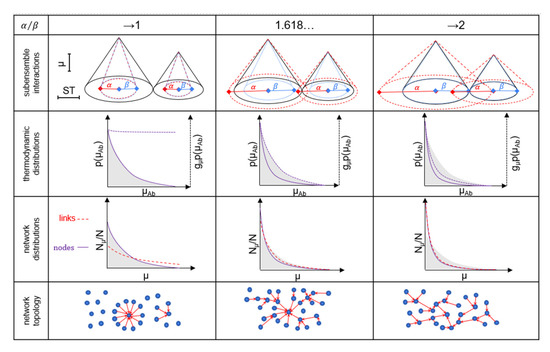 According to Caetano-Anollés et al. [48], scale-free networks can follow a trajectory in network morphospace from homogenous, non-modular towards heterogenous, modular network organization. This trajectory can correspond to a mesh-like structure of random binding events at the core surface of the system, evolving into a highly hierarchical and modular network of specific and high-affinity interactions. This corresponds to a star-like network distribution of energy when α/β approaches 1 and multiple transfers of energy when α/β increases (Figure 5). Whereas the probability density of binding energy is associated with a Boltzmannian distribution, scale-free networks are known for the power law distribution of network node degree. Our configuration space model of a system suggests that these two phenomena are two sides of the same coin; an identical, complementary cumulative distribution results in the exponential probability density function of chemical potential and power law probability function of node degrees of elements of the system (see Appendix B).