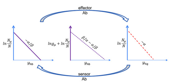 Self-organization is the ability of a system to arrange its constituents so as to adjust to its environment and also maintain a responsive state. Self-organizing systems tend to reach an optimal state associated with minimal interaction and dissipation [21,22,23]. The immune system adjusts the quality (intensive physical property) and number of molecules (extensive physical property) in the host by the coupling of a sensor and an effector mechanism [20]. The sensor mechanism is a B cell that survives only in the presence of signals triggered by the target molecule via an Ab displayed on the cell surface. The effector mechanism is the generation of molecules, soluble Abs, that bind both to the target molecule and to cells that remove the resulting complexes. Coupling means the balanced adjustment of the chemical potential μ of the Abs on the sensor surface and of the effector molecules against that molecule species. Biologically, it means that the sensor and effector B cells are genetically closely clonally related, expressing identical or similar Abs either on their surface or as secreted components. Relations in terms of network connectivity are determined not only by similarity but also by the similarity of interaction partners [24]. In the case of the humoral immune system, this means that Abs that are clonally not or only distantly related may contribute to the binding and elimination of a given Ag molecule. In other words, in a subnetwork of the system dedicated for a given Ag, distinct Ab clonotypes may be linked together in the network of Ag transfer pathways. The concept of clone sizes and corresponding Ab chemical potential and Ag thermodynamic activity, with corresponding chemical potentials, can be visualized by activity maps and energy diagrams (Figure 2). The thermodynamic activity of a particular Ab clone is related to the frequency of the cells belonging to that clone (clone size) and the serum concentration of Abs. The chemical potential of an Ab is the logarithm of its activity. Similarity is represented by the topology of the activity map, with closely related clones being neighbors. The thermodynamic activity of an Ag is related to its ability to stimulate the immune system and the corresponding chemical potential is its logarithm. Again, structural similarity is represented by location in the activity map.