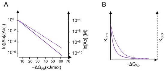 Antibody concentrations and equilibrium affinity constants. (A) Relative (left axis) and absolute (right axis) concentrations of Abs with indicated binding energies. (B) KD values corresponding to binding enthalpy for a monoclonal Ab solution (solid purple line) and for a serum Ab (dashed line) with entropy effects. ΔGAb, free energy of interaction; KD,H, equilibrium dissociation constant calculated from enthalpy; KD,H, equilibrium dissociation constant calculated from Gibbs energy.