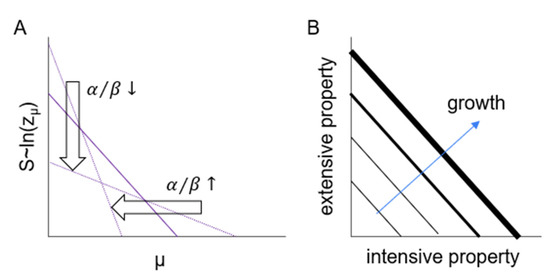 Frequency is an extensive property and corresponds to the number of links (interactions) of a given energy in our model. If the energy of interactions is distributed exponentially (Equations (4) and (12)), then the logarithm of probability (Equation (9)) decreases linearly (Figure 6, Figure 7 and Figure 8). The corresponding linear growth of entropy (for cumulative distribution) is characteristic of criticality in thermodynamic systems [16,58]. In unchanging, simple surroundings, the system can strongly adapt (Figure 8, vertical arrow) and distribute its energies over a wider range of chemical potentials. On the other hand, changing, diverse surroundings prohibit effective adaptation (Figure 8, horizontal arrow), allowing large numbers of weak interactions. The system can develop and grow, maintaining its organization by parallel growth of its intensive and extensive properties, chemical potentials and the number of interactions as a function of those potentials, respectively.