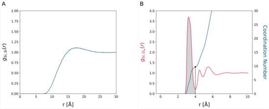 In addition, the radial distribution function of the oxygen atoms of water about the silicon atoms of Si(OH) (Figure 1B), describes a layout of ordered solvation shells peaking at 3.5 Å: This is associated with a first solvation layer of 10 water molecules about each molecule of orthosilicic acid (as shown by the shaded area and the solid blue line in Figure 1B, depicting the cumulative value of the ), which is in line with Si(OH) being (moderately) soluble in water.