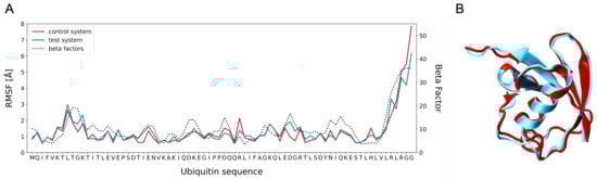(A) RMSF and (B) average structure of the control (red) and test (blue) ubiquitin systems, displaying a high similarity between the dynamics of the two investigated scenarios. Both RMSF trends match the experimental beta factors of the -carbons in the ubiquitin sequence (dashed line in (A)).