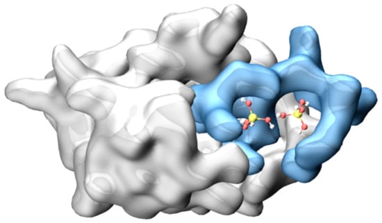 The structure of ubiquitin, depicted as an electron density isosurface: The cavity on the surface of ubiquitin, seamlessly hosting two molecules of orthosilicic acid in the test scenario, is highlighted in blue (details in the text).