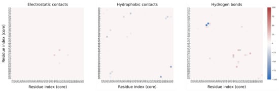 Heatmaps of the electrostatic and hydrophobic contacts, and hydrogen bonds, between the residues of the ubiquitin-like core of SUMO-1, obtained by subtracting the value of occupancy of each intermolecular interaction in the control and test scenarios.