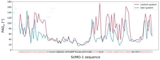 Profile of the PAD on the first 325 nanoseconds of the control (red) and test (blue) trajectories of SUMO-1—residues belonging to unstructured domains are highlighted in red.