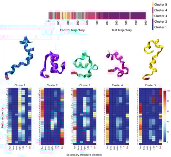 Briefly, each frame (that is, one frame every 0.5 ns from both trajectories) is assigned a string array, by associating each residue to a secondary structure element, i.e., ‘H’ for helix, ‘E’ for sheet, ‘C’ for coil, and so on. Thus, the Hamming distance between these strings, defined as the amount of different characters at each location of the array, is calculated, and employed as a similarity metric for a hierarchical clustering assessment of the frames upon an average-linkage criterion (see the Materials and Methods section). The output of this procedure is depicted as a dendrogram (shown in Figure S7 in the Supplementary Data), whereby we isolated five significant clusters from the merged trajectory.