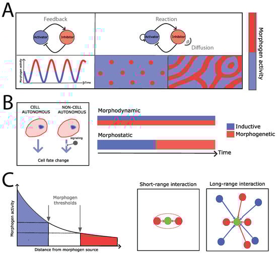 Concepts about patterning: models and mechanisms. (A) Symmetric-breaking events in space and/or time lead to pattern formation. Temporal patterns require feedback loops between “species” and spatial patterns (e.g., spot-like, stripe-like, etc.), reaction–diffusion interactions where the dynamics of diffusive signals (morphogens) are coupled with the regulation of species. (B) A broad, functional, classification of biological patterning mechanisms. Left: In cell autonomous/non-autonomous mechanisms, the cellular activity generates patterns without/through mechanical and/or biochemical signaling. Right: Inductive and morphogenetic mechanisms operate simultaneously (morphodynamic patterning) or sequentially (morphostatic patterning). (C) Mechanisms of patterning: long-range versus short-range interactions. The French flag model (left) provides a framework to understand how cells “read” their positional information depending on their distance from a diffusive signal source. Right: Short-range interactions rely on nearest-neighbors events (length-scales typically on the order of the cellular size: red dashed circle). In opposition, long-range interactions span distances typically larger than the cellular size.