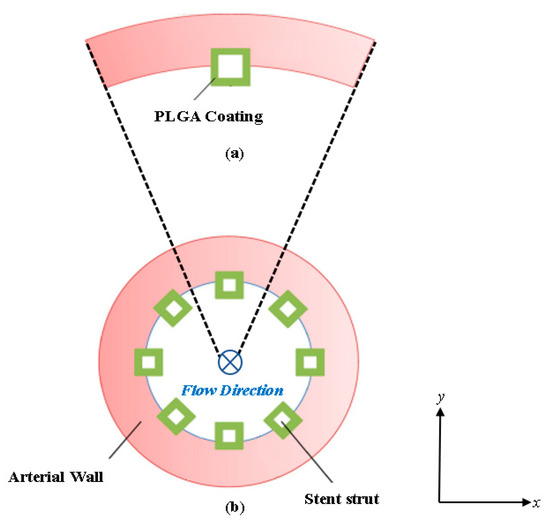 In this work, an implanted drug eluting coronary stent (as shown in Figure 1a) is analyzed in the coronary artery where the stent struts are evenly placed and half-embedded in the cross-section of the lumen (as shown in Figure 1b).