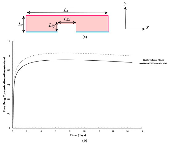 For validation and verification of the developed finite volume scalar model, we compared the free drug concentration profiles in the arterial domain of the developed finite volume scalar model with a MATLAB finite difference code developed in our previous work [33]. Similar to the finite volume scalar model, the MATLAB finite difference model uses a cartesian coordinate system that describes the arterial domain, including the square-shaped stent strut. A rectangular domain is used as opposed to a curvature domain, as shown in Figure 3a. The same dimensions for the arterial domain are used for the finite difference and finite volume simulations. The same boundary conditions are imposed in the MATLAB finite difference code. Additionally, the same dimensionless diffusion equations are implemented in the MATLAB finite difference code. The PLGA coating is not modeled in the finite difference code. For the finite difference solution, a numerical grid with a size of 400 × 200 and an initial time step value of δt = 0.00001 s was used for the sake of computational power and time.