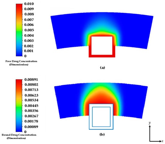 Figure 6 shows the free and bound drug concentration contours at 8 days. Similar to the results shown in Figure 5a,b at 2 h, the high convection due to plasma flow and the eroding effect of the polymer has a significant effect on the transit time and diffusion profile. It also appears that when modeling the polymer boundary as porous media without the no-slip condition, washing out of the polymer tends to lower the concentration magnitudes. It is evident that the presence of interstitial flow increases the transport in the transmural direction and leads to faster drug clearance at the perivascular interface using this modeling method. In an effort to compare other works, we continued this study by applying the no-slip condition at the boundaries of the polymer and arterial wall interface and not incorporating interstitial flow with plasma flow through the inlet. Convection is modeled with the tissue Peclet number.