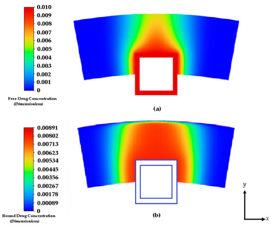 As mentioned previously, the results shown in this section are results from the simulation by applying the no-slip condition at the boundaries of the polymer and the arterial wall interface and neglecting the interstitial flow with plasma flow through the inlet. Convection, in this case is modelled with the tissue Peclet number. Figure 7a,b show the free drug diffusion contours in the arterial wall with convection modeled with the tissue Peclet number. The drug release contour profiles have similar release rates in the first 4 to 8 days when the PLGA diffusion, degradation, and erosion are insignificant. In Figure 7b, a lower concentration of the free drug in the polymer coating is observed in the case of time-dependent release of the drug from the coating. This is due to the time-dependent boundary condition of Equation (21). The effect of release kinetics on the spatial distribution of the free drug can be visualized clearly in Figure 8. In this case, the heterogeneous distribution and retention of the drug are found to be observed throughout the domain.