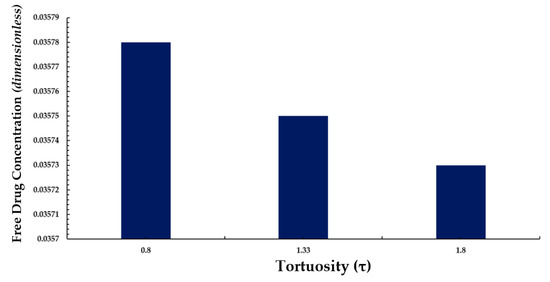 We also conducted a simple analysis to demonstrate the effect of tortuosity (τ as listed in Equation (11)) on the average weighted concentration. We observed that a decrease in the mean concentration of free drug took place with while increasing tortuosity (i.e., an inverse relationship between free drug concentration and tortuosity is revealed) as shown in Figure 13. A similar pattern is also observed for bound drug in Figure 14.
