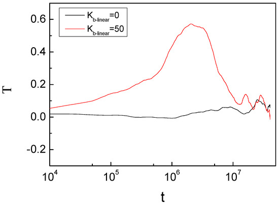 In fact, due to the formation of a ring-threaded phenomenon in the semiflexible linear chain, the diffusion of the ring chain in the blend system is slow. As shown in the table below, as Kb-linear increases, the gap between τnormal and τorientation gradually becomes larger, which is consistent with the screenshot shown in Figure 1c. Additionally, the normal relaxation time of the semiflexible ring is much longer than the relaxation time of the parallel direction τnormal > τorientation, that is, the semiflexible ring spreads along the extension direction of the rod-like linear chain through its center. However, it is temporarily confined to the cage in the direction of the plane parallel. Our results help us to understand the special topological conformation and dynamic behavior of the semiflexible ring in ring–linear polymer blend systems.