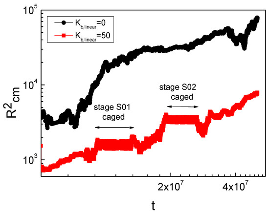 Rcm2 in Figure 4 represents the “diffusion trajectory” of the semiflexible ring chain, i.e., the square displacement of the centroid of the ring from the corresponding simulated sample at a certain moment relative to the initial position and zero time. For the ring diffused in the flexible linear chain matrix, such as the black curve in Figure 4, random walk diffusion behavior can always be found. However, for the semiflexible linear chain system of Figure Kb-linear = 50, the red curve shows a shorter plateau, as shown in Figure 4, a plain that is temporarily stuck due to the ring being bound by the linear chain through for stage S01. After this chain is temporarily removed at S01, linear chains can be retracted or “slipped” from the ring relatively easily. From the corresponding molecular conformation, it is found that the rings are still connected along the trajectory segment between stage S01 and stage S02. The ring is soon crossed by another chain, corresponding to stage S02, as shown in the illustration. The plateau becomes more visible in the figure. After stage S02, the chain temporarily escapes the caged state, and the ring begins to return to normal diffusion.