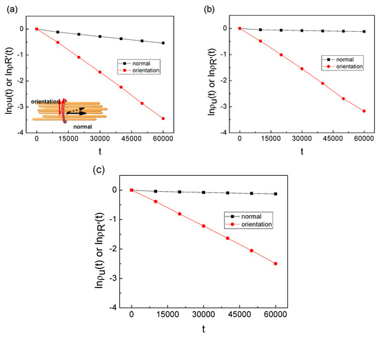 lnρn(t) or lnρR’(t) as a function of t for a semiflexible ring chain for Kb-linear = 0 (a), Kb-linear = 10 (b), Kb-linear = 50 (c).