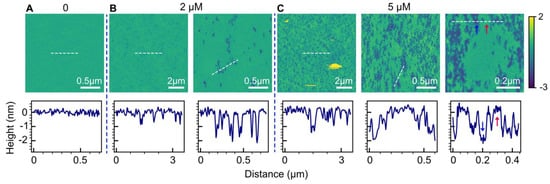 When the peptide concentration was increased to 5 µM, a considerable expansion in both the number and size of disrupted regions within the bilayer was observed. These disruptions no longer resembled isolated holes but rather irregularly shaped regions coexisting with the intact bilayer. It appeared that the peptide disrupted the POPC bilayer by extracting lipids, resulting in these irregularly shaped features, all with a consistent depth of ~2 nm, as confirmed by height profile measurements.