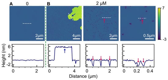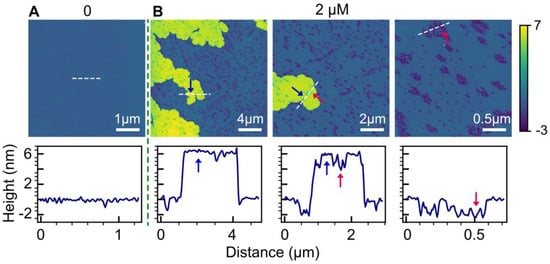 Influence of anionic POPG lipids on bilayer perturbations induced by HttN. The lipid bilayer comprises a mixture of POPC and POPG in a 4:1 molar ratio. Panels (A,B) depict bilayer structures before (A) and after (B) exposure to 2 µM HttN. Three images obtained at different scan sizes are provided for the 2 µM HttN condition. In the lower panels, height profiles along the white dashed lines, as indicated in the AFM images, are displayed. Disrupted bilayer regions are highlighted by red arrows, while elevated double-bilayer structures, measuring 6 nm in height above the main bilayer, are indicated by blue arrows.