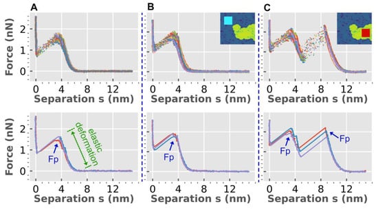 We also utilized AFM-based force spectroscopy to further investigate the double-bilayer structures induced by HttN in POPC/POPG bilayers. Figure 3 presents the force spectroscopy results obtained before and after introducing 2 µM HttN. In Figure 3A, a composite of around 200 force curves is displayed, which were acquired while the AFM tip approached the bilayer and subsequently punctured it. The separation distance, denoted as ‘s’, represents the distance between the AFM tip and the mica substrate.