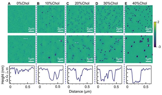 Influence of cholesterol content on bilayer alterations induced by 2 µM HttN. The bilayer compositions investigated include (A) POPC, (B) POPC with 10 mol% Chol, (C) POPC with 20 mol% Chol, (D) POPC with 30 mol% Chol, and (E) POPC with 40 mol% Chol. Two AFM images, acquired at different scan sizes, are presented for each lipid composition. The bottom panels illustrate height profiles along the white dashed lines shown in the AFM images from the second row.