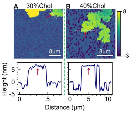 Height measurements revealed that the elevated patches had a height of near 6 nm, exceeding the thickness of the main bilayer (as seen in Figure 5E, which is 3.7 nm thick). However, the elevated patch cannot be attributed to two bilayers because only one additional puncture event was observed in our force spectroscopy measurements (Figure 3). One possible explanation for the 6 nm thickness of the elevated patch was the presence of a water layer separating it from the main bilayer. Such a situation is not uncommon, as water spacing typically exists between neighboring bilayers in multilamellar vesicles. Indeed, previous studies employing X-ray diffraction have reported a repeating spacing of about 6 nm in multilamellar vesicles [74,75]. These findings may elucidate the observed 6 nm thickness of the elevated patches in our study.
